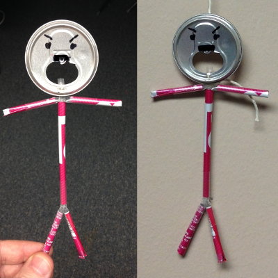 The generic hangman figure adds clear straw segments, a staple, string, a pushpin, and adhesive tape. The head is attached to the noose by dental floss or string wrapped around the neck, which is then routed with tape around the screaming mouth. To attach the legs, I inserted tubes into two ends of a straw segment, folded it in half, then stuffed it into another straw extending out from the pelvis. For the neck, I inserted the middle of the arms-straw into the throat-tube, then stuffed the neck-straw into it.