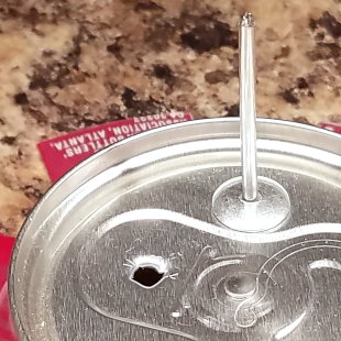 Incidentally, if you used the nail, you may want to rotate it in a circle a bit to enlarge the hole slightly; this makes the rivet easier to insert, since the nail diameter is a bit small. Also, if you don't use a greenie, and hammer directly on the aluminum mandrel's tip, you'll just knock the mandrel out of the rivet body through the can, destroying the rivet.