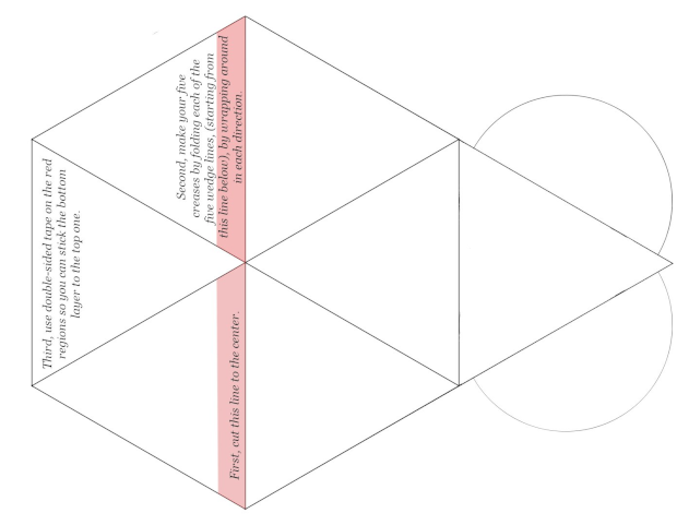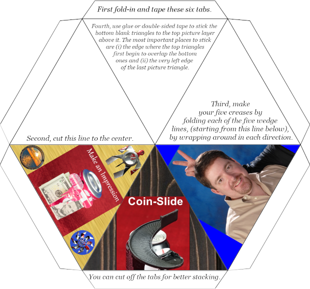 As you can see, a hexagon is made of six equilateral triangles grouped around a center point. So if you print your photos on three of those triangles, you can then wrap the hexagon twice around the top surface of the tetrahedron. You'll get two layers of triangles on the top surfaces of the PhotoTet™ form for added strength, stability, and opacity. This open-bottom design allows you to stack multiple PhotoTets™ like plastic Solo cups (or Russian nesting dolls, if you prefer).
