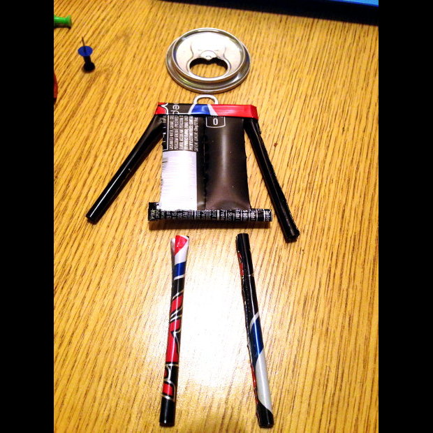 To make him into a puppet, you'll want to make pushpin holes that can act as pivot points. I suggest placing them in the shoulders and upper thighs for the jumping jack Standroid.